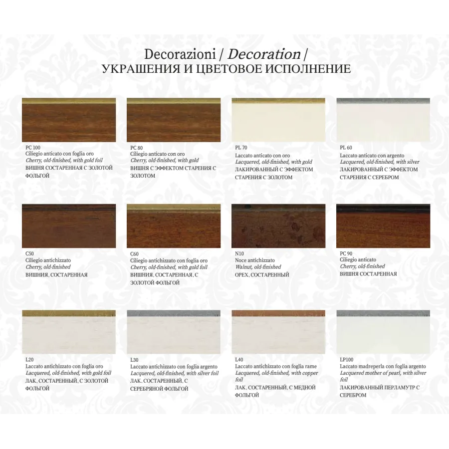 Wnętrze zaaranżowane meblami z tej kolekcji to jasna, harmonijna przestrzeń, w której dominuje mlecznobiała kolorystyka oraz złote liście subtelnie zdobiące rzeźbione dekoracje. Każdy detal, każda linia została zaprojektowana z największą starannością przez najlepszych włoskich architektów i projektantów, a możliwość wykonania mebli na zamówienie pozwala sprostać nawet najbardziej wyszukanym oczekiwaniom.
