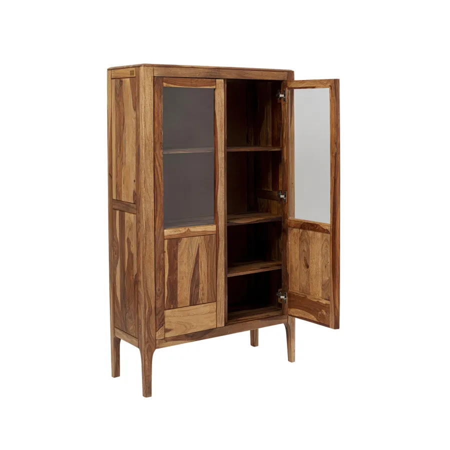 Panel tylny: eukaliptusowa płyta pilśniowa średniej gęstości (MDF) olejowana, drzwi: szkło przezroczyste, mango lite drewno bejcowane-lakierowane, półka