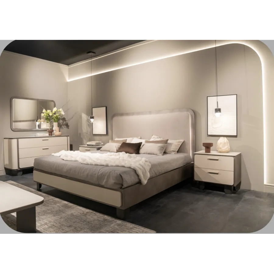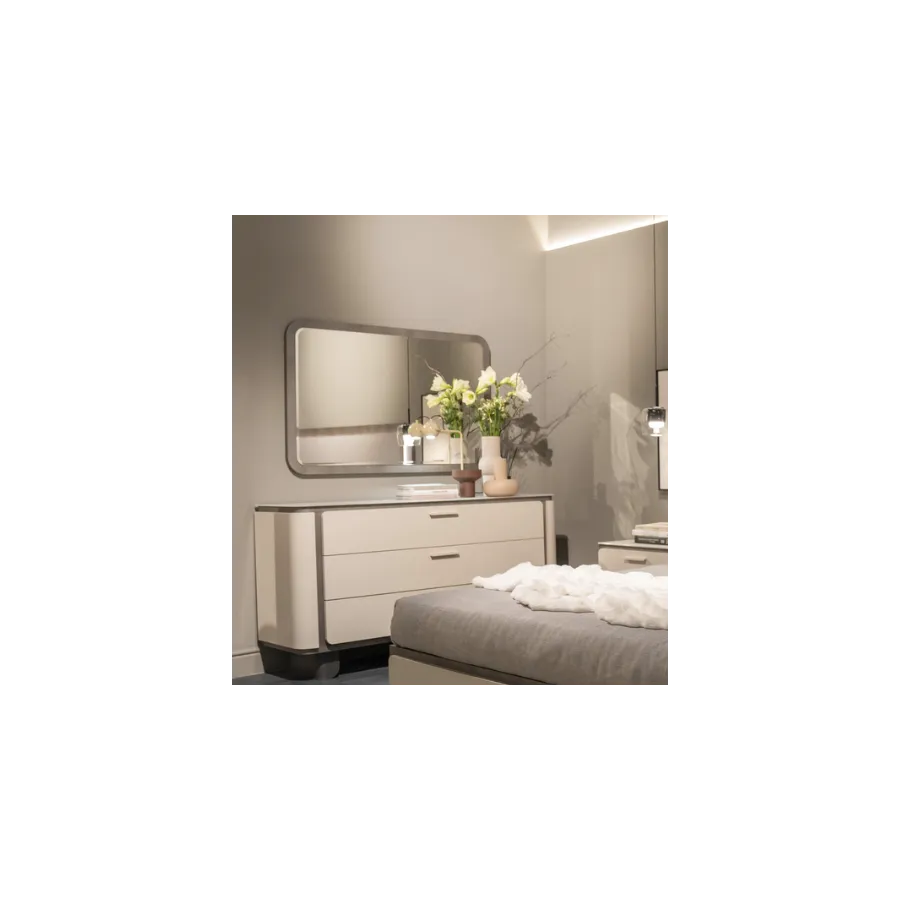 Szafki nocne i komoda z lustrzanym akcentem to nie tylko elementy wyposażenia – to rzeźby funkcji. Zaokrąglone krawędzie, stonowana kolorystyka i perfekcyjnie dopracowane proporcje sprawiają, że każdy mebel staje się elementem spójnej, eleganckiej całości.