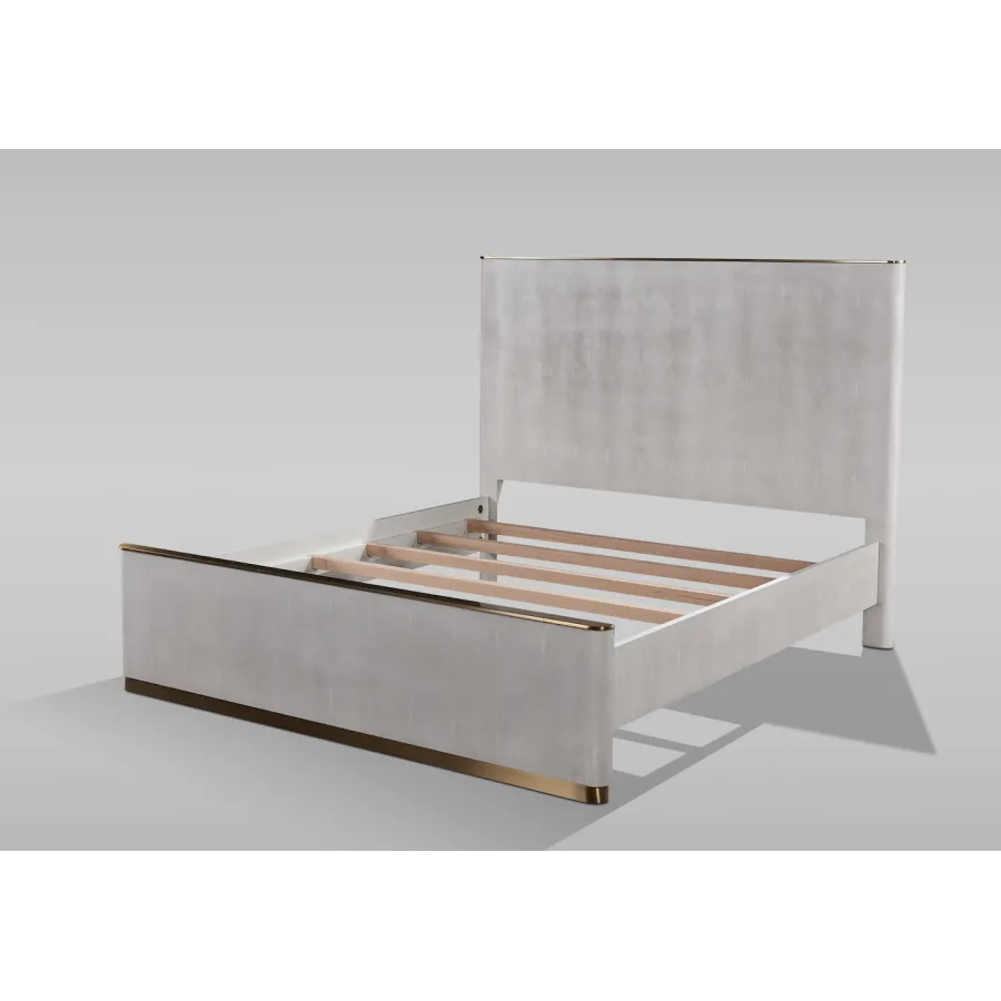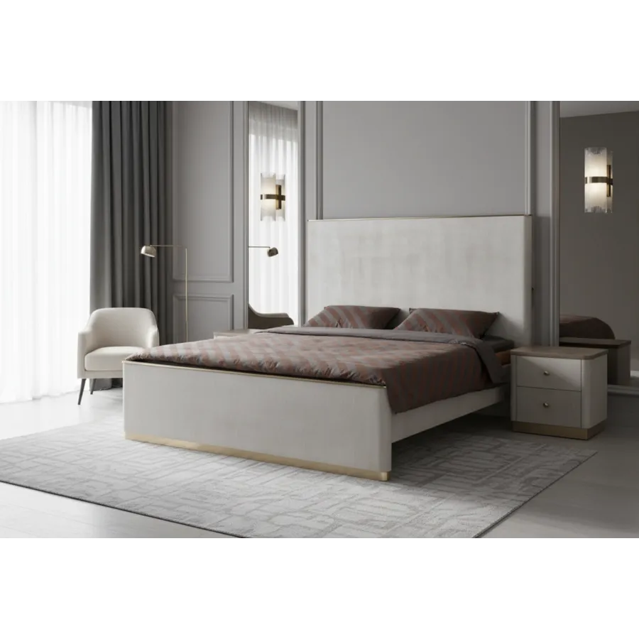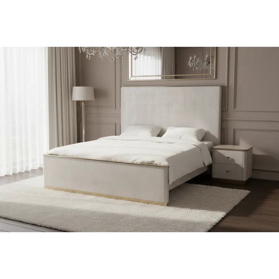 Łóżko tapicerowane stanowi połączenie beżowej tkaniny o wyczuwalnej strukturze z delikatną ramą w kolorze szampańskiego złota. Subtelne wykończenia i złote akcenty nadają mu luksusowego charakteru, a minimalistyczna forma doskonale wpisuje się w aranżacje w stylu modern classic, glamour lub contemporary.