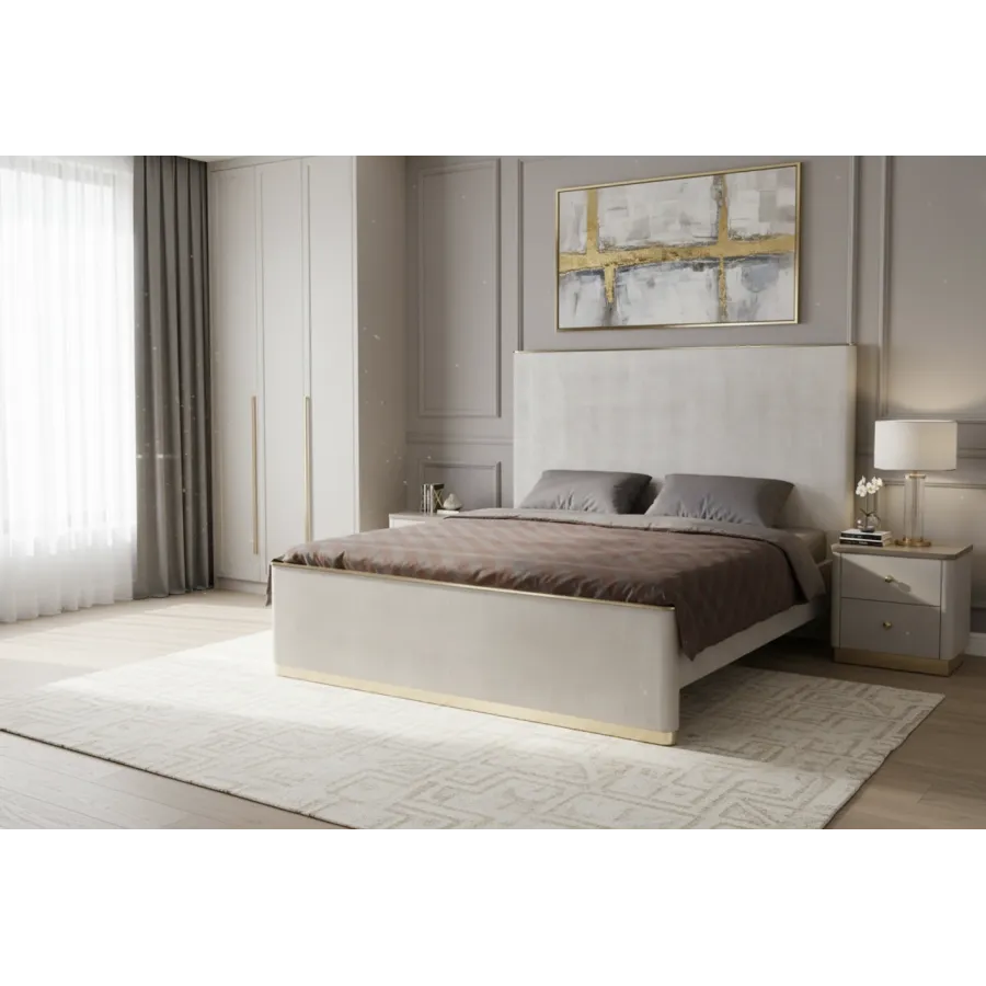 Łóżko tapicerowane stanowi połączenie beżowej tkaniny o wyczuwalnej strukturze z delikatną ramą w kolorze szampańskiego złota. Subtelne wykończenia i złote akcenty nadają mu luksusowego charakteru, a minimalistyczna forma doskonale wpisuje się w aranżacje w stylu modern classic, glamour lub contemporary.