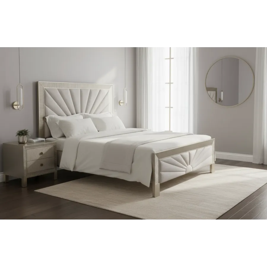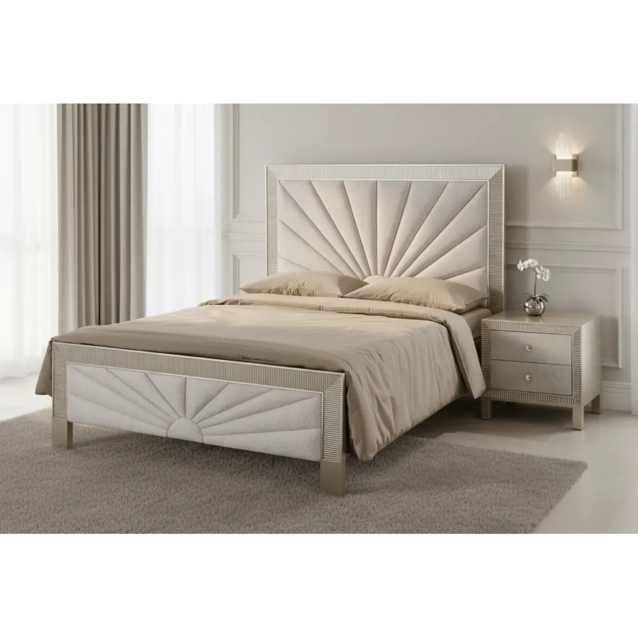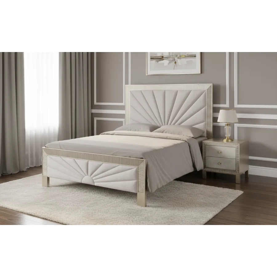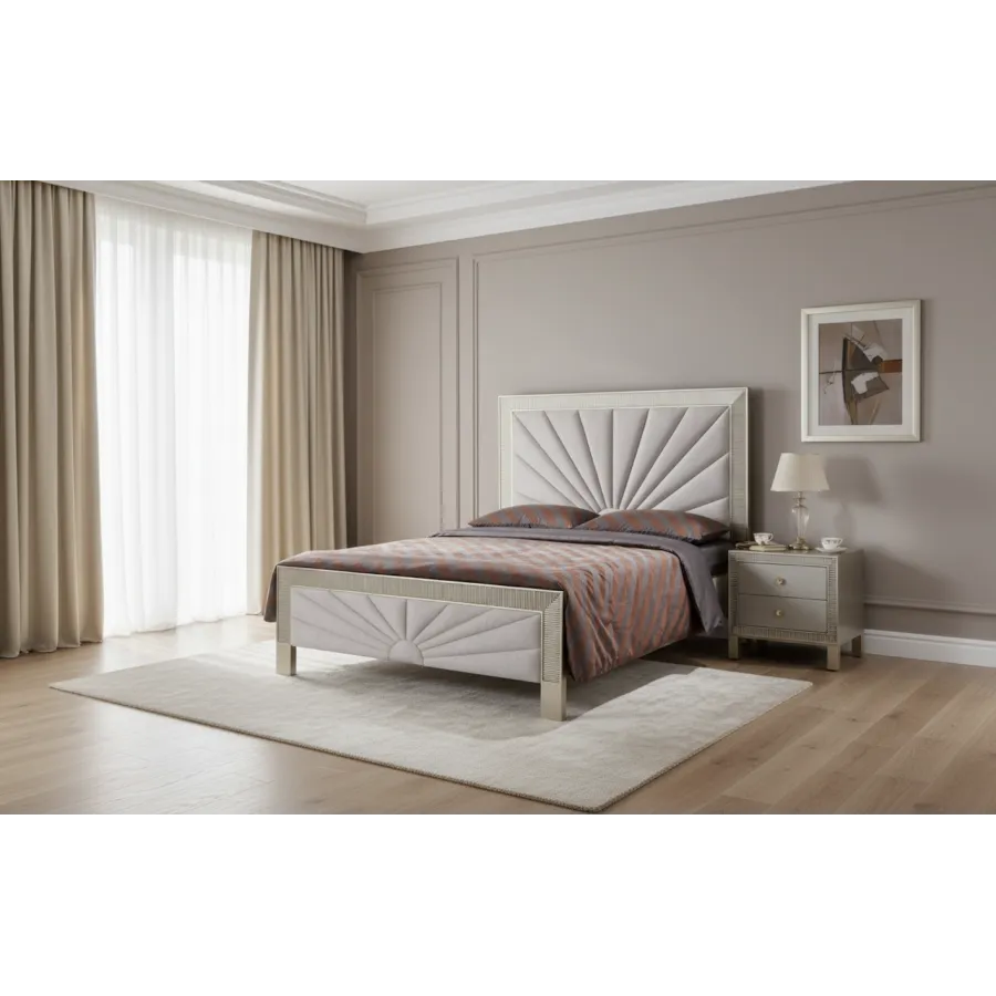 Zestaw składa się z łóżka ST900Q o szerokości 160 cm oraz dwóch szafek nocnych ST901, tworząc perfekcyjnie dopasowaną całość w stylu nowoczesnego glamour.