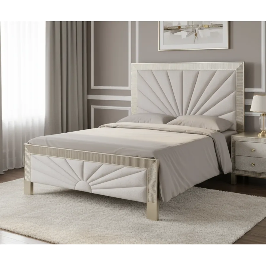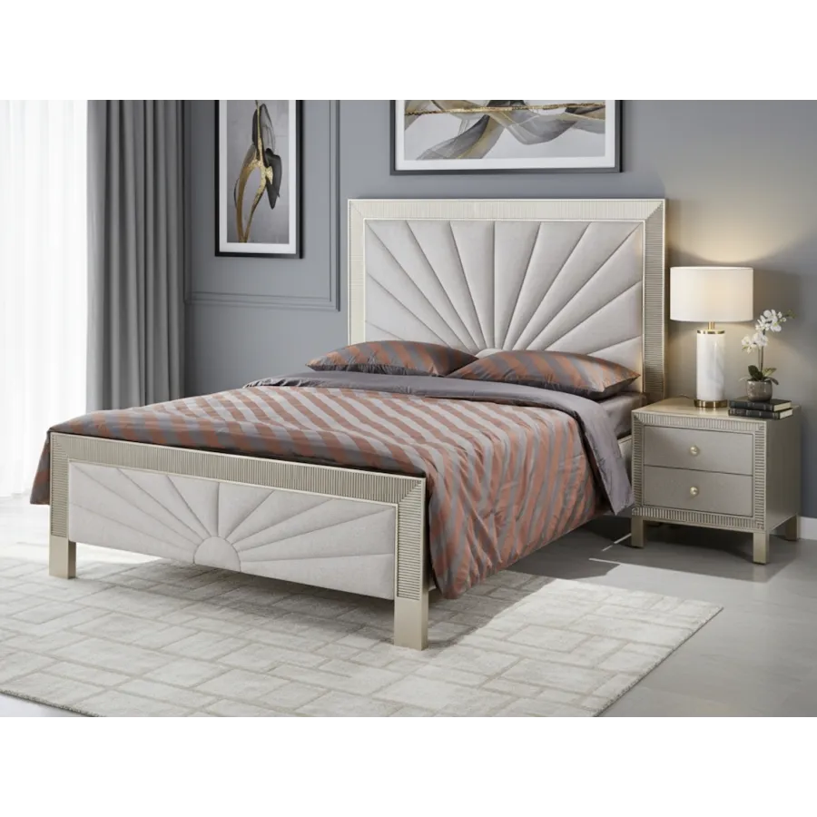 Łóżko tapicerowane zachwyca subtelnym połączeniem kolorów – rama w odcieniu szampańskiego złota podkreśla elegancję beżowej tkaniny o wyczuwalnej strukturze.